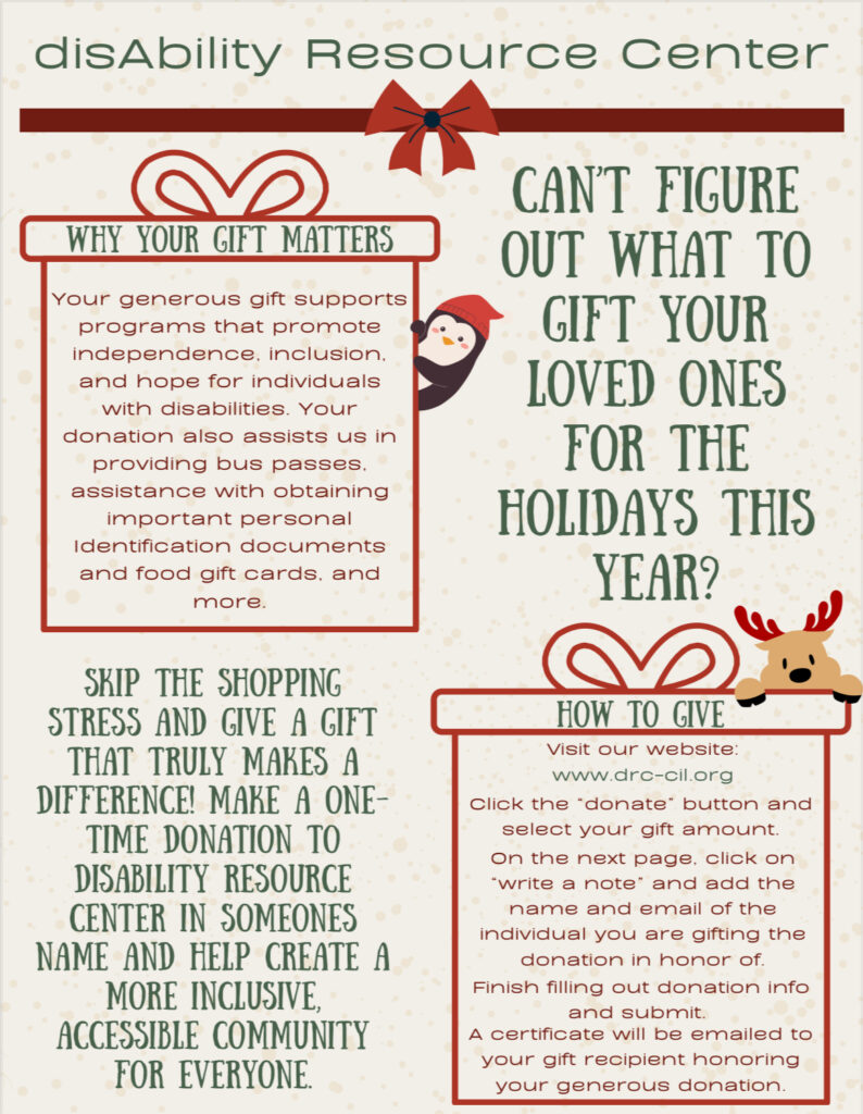 The mission of the disAbility Resource Center (dRC) is to empower persons with disabilities to become and maintain their independence in their communities.